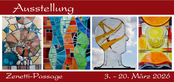 Gemeinschaftsausstellung im Atelier KUNST IN GLAS der Glaskünstlerin Reining-Hopp, Schützenstraße 21 in Wertingen. mit Werken von Sonja Schnürer Mosaik- und Steindesign Michael Plohmann Keramikobjekte Helmut Röhm Gartenskulpturen Claudia Reining-Hopp Glasobjekte Wolfgang Reining Holzobjekte